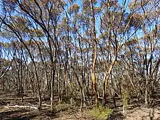 This mallet occurs on sandplains and undulating areas along the south of Western Australia in the southern Wheatbelt and south western Goldfields-Esperance regions where it grows in red loam, grey sandy loam and sometimes gravelly soils.[4]