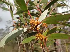 Eucalyptus moorei, commonly known as narrow-leaved sally,[2] is a species of mallee that is endemic to New South Wales. It has smooth bark, linear to narrow lance-shaped or curved adult leaves, flower buds in groups of between seven and fifteen, white flowers and cup-shaped or shortened spherical fruit.