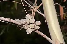 Eucalyptus olsenii, commonly known as the Woila gum,[2] is a species of small tree that is endemic to a restricted area on the Southern Tablelands of New South Wales. It has smooth bark with rough bark on the lower trunk, lance-shaped to curved adult leaves, flower buds in groups of seven, white flowers and barrel-shaped or urn-shaped fruit.