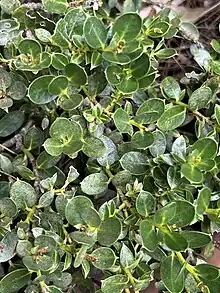 Eucalyptus vernicosa, commonly known as varnished gum,[2] is a species of shrub or a mallee that is endemic to mountainous areas of Tasmania. It has smooth greyish bark, crowded, egg-shaped to elliptical or round leaves, flower buds singly or in groups of three in leaf axils, white flowers and hemispherical or bell-shaped fruit.