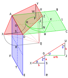 The final three books (11–13) primarily discuss solid geometry.[39] By introducing a list of 37 definitions, Book 11 contextualizes the next two.[56] Although its foundational character resembles Book 1, unlike the latter it features no axiomatic system or postulates.[56] The three sections of Book 11 include content on solid geometry (1–19), solid angles (20–23) and parallelepipedal solids (24–37).[56]