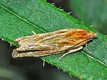 Eucosma cana can reach a body length of about 11.5 mm (0.45 in) and a wingspan of 16–23 mm.[4] The head of these moths is reddish brown, while the thorax is light brownish on the sides, dark brownish in the middle. The ground colour of the forewings is light brown or greyish, with light longitudinal discal streaks. The edges are feathered. The hindwings are dark gray toward the margins. This species in rather similar to Eucosma hohenwartiana,[4] which has a darker ground colour of the forewings, lacking the longitudinal lighter streaks. Meyrick describes it -The forewings are elongate, fold reaching to near middle ; ochreous, somewhat blackish -sprinkled, with several suffused ochreous whitish longitudinal streaks confluent in middle towards base, ceasing before very narrow central fascia of ground-colour ; an oblique wedge-shaped ferruginous suffusion from dorsum near base ; posterior half of costa with very oblique whitish strigulae, abruptly ceasing at 1/3 ; ocellus metallic-edged, containing one or two incomplete black dashes ; termen sinuate. Hindwings in male pale grey, darker terminally, in female darker.The larva is dull pink ; head and plate of 2 brown. [5]