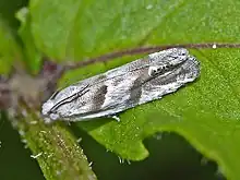 The wingspan is 14–19 mm. This moth has a characteristic wing pattern, with a whitish ground colour, pale brown fasciate markings on the forewings and well-developed black ocelli.[2] Adults have been recorded on wing from July to August in Europe.