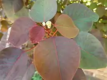 The scientific name of the plant comes from the words cotinus meaning "smoketree" and folia meaning "leaf".[2] Common names for the species include smoketree spurge, tropical smoke bush, Caribbean copper plant,[3] and Mexican shrubby spurge.[4]