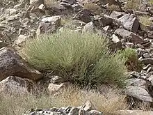 Euphorbia larica is a perennial evergreen shrub or subshrub which grows up to 150 cm (59 in) in height. It has many erect stems rising close together. The upper stems and young stems are light-green, while the lower stems are smooth, brown, and woody. Leaves are small and nearly absent. Like many other euphorbias, the stems exude a milky sap when broken. It flowers from November to April, producing small yellow flowers on terminal and upper lateral spikes.[2]