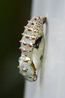 Males actively patrol for females.[2] Females lay their pale-green or cream-colored eggs singly on host plant leaves and stems. The larva eats the leaves, flowers, and stems of the food plant.[2][11] The larva is red with black subdorsal and spiracular stripes infused with white spotting. In many individuals, the white is more conspicuous than the black. The red middorsal stripe bears white (sometimes black) oval-shaped spots, one per segment.[12] It has six rows of black spines and has a pair of long, clubbed spines on the head.[13][11] The chrysalis is mainly shiny white, with small black spots, a variable amount of brown markings, and orange and gold tubercules. Adults overwinter in the south and fly north each spring and summer.[11] It has 2–3 broods per year.[4]
