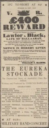 Eureka Stockade is a 1933 Australian radio play by Edmund Barclay about the Eureka Rebellion. It was one of the first radio scripts by Barclay who went on to become arguably Australia's leading radio writer.[3]