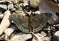 Female. Similar, paler. Upperside forewing: the transverse crimson bands in cell obscure with a broad black-bordered white band interposed, the discal series of white spots very large, very irregular in shape. Hindwing: the ground colour suffused with greenish blue on terminal posterior half of wing; markings similar to those of the male. Underside brown, the tornal half of the hindwing bluish green. Forewing: the markings as on the upperside with the addition of two small black spots at base and an obscure broad terminal pale band. Hindwing with four black-bordered transverse crimson spots at base in addition to the markings as on the upperside. Antennae, head, thorax and abdomen as in the male, but paler; the palpi beneath with a stripe of pink, the forelegs whitish.[4][5]