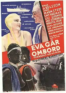 Eva Goes Aboard (Swedish: Eva går ombord) is a 1934 Swedish comedy film directed by Lorens Marmstedt and starring Einar Axelsson, Astrid Marmstedt and Emy Hagman.[1] It was shot in Stockholm and Gothenburg with footage use from a variety of locations the ship calls at including Egypt, Monaco, India and Kenya.