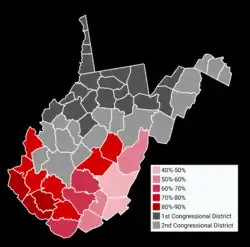 Map showing the results of the 2016 election in West Virginia's third congressional district by county