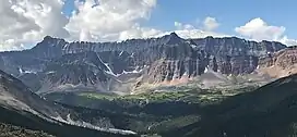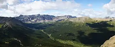 Evelyn Peak is a 2,855 m (9,367 ft) mountain summit in the Athabasca River valley of Jasper National Park, in the Canadian Rockies of Alberta, Canada. THe nearest higher peak is Mount Kerkeslin, 5.0 km (3.1 mi) to the southwest, and Mount Hardisty is 6.0 km (3.7 mi) to the northwest.[1] All three are part of the Maligne Range. Evelyn Peak is composed of sedimentary rock laid down during the Cambrian period and pushed east and over the top of younger rock during the Laramide orogeny.[3] The mountain is at the headwaters of Evelyn Creek,[4] and three kilometres south of Evelyn Pass.[5] The creek and pass were named in 1921 for Evelyn Cavendish, Duchess of Devonshire (1870–1960), who visited nearby Maligne Lake in 1920.[6] The mountain's name however, has not yet been officially adopted by the Geographical Names Board of Canada.