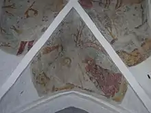The late medieval murals were painted in about 1500 by the so-called Everlöv Workshop which bears strong similarities to the Brarup and Elmelunde Workshops in Denmark.[3] The vaults in the chancel are decorated with paintings of the four Evangelists. Those in the nave include the Creation, Adam and Eve, Lazarus, the Nativity and the seven deadly sins.[1]