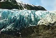 Exit Glacier is a glacier derived from the Harding Icefield in the Kenai Mountains of Alaska[1] and one of Kenai Fjords National Park's major attractions. It is one of the most accessible valley glaciers in Alaska and is a visible indicator of glacial recession due to climate change.[2][3] Exit Glacier retreated approximately 187 feet (57 m) from 2013 to 2014 and park scientists continue to monitor and record the glacier's accelerating recession.[4]