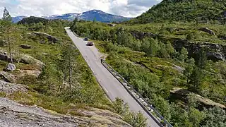 Rørvik Mountain, the trail with the fascinating stone walls and a marvellous view over Haukedalen. Along Råheimsdalen and Eldalen to the Gaularfjellet mountains, you will see a marvellous waterfall landscape that has been landscaped with paths for visitors. From the top of Gaularfjell mountains, hairpin bends wind down to the Vetlefjorden, an arm of the Sognefjorden. The breathtaking contrasts of steep mountainsides, winding roads, and waterfalls are characteristic of Western Norway’s exceptional scenery.[33]