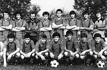 Shkëndija won the division in the 1979–1980 season, resulting in Shkëndija being promoted into the Third division.[4] After claiming the third division title in the 1980–1981 season, Shkëndija was then again promoted into the Second division. However, as the popularity of the club began to increase among the Albanian population of Yugoslavia, the ruling socialist government members disbanded the club, worried that the club would stoke ethnic tensions during a fragile period in SFRY.[4]