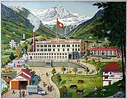 The best-known example of such a success story is the curriculum vitae of the entrepreneur Carlo Gatti (1817–1878) from Dongio in the Blenio Valley,[6] whose restaurants and ice cream production brought him great wealth in England. The Cima family, who came from the commune of Aquila (today the commune of Blenio) and partly emigrated to the south of France, founded a chocolate factory in their valley of origin. Descendants of this long-established family, which had been wealthy since the 16th century, had already founded the first chocolate factory in Milan around 1750 and took over factories founded by their compatriots in Nice around 1800 and in Frankfurt around 1870.[7][8] In addition, the manufacturer Maestrani in Flawil, Switzerland, goes back to a chocolatier from the municipality of Aquila. Also in distant Santiago de Chile, these emigrants founded the chocolate factory Giosia Luis, Hermano & Cia in 1875, which belongs to Nestlé Chile today.[9]