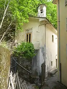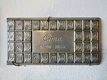 The imposing third production building of Fabbrica di Cioccolato Cima Norma S.A., built with a claim to representation and aesthetics,[23][24] was built after severe elemental damage to the two previous buildings occurred and has its own workers' apartments ("Pensione per Operaie"). It had a factory chapel and its own power plant fed by water power of the river Soia,[8] and to this day dominates the townscape of the mountain village of Dangio-Torre,[25] which has hardly grown since then. The building is a design by engineer Alfonso Zoppi (1879–1942) from 1917. At the same time, Zoppi was involved in the construction of the Biasca–Acquarossa railway, which he managed from 1910 to 1917.[26] In the Torre cemetery, the mausoleum of Giuseppe Pagani can be visited, which has marble reliefs on the outside and an elaborate ceiling mosaic on the inside. It was built in 1930 according to plans by the architect Enea Tallone (1876-1937).[27][28] Another architectural heritage is the Villa Pagani (also: Villa Lina) by the architect Giuseppe Martinoli from 1897, with a riding stable from 1904.[28] The sons-in-law who were entrusted with the management after the death of Giuseppe Pagani also had their own villas built (Villa Antognini, Villa Ferrazzini).[11] Numerous production rooms are now open to the public. A permanent exhibition shows the history of the Cima Norma.