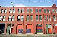 The former warehouse occupied by the club was at 11–13 Whitworth Street West on the south side of the Rochdale Canal: the frontage was curved and built of red Accrington brick. Before it was turned into a club, The Haçienda was a yacht builder's shop and warehouse.[5]