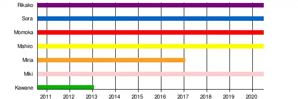 On June 17, 2020, it was announced by Rising Production that after several discussions with the members, Rikako Inoue, Sora Nomoto and Mahiro Hayashida has decided to end their contract with the agency, with Rikako also retiring from the show business. Momoka Ito and Miki Shimomura will remain in the agency working individually.[9] Although the activities ended as a group, the agency revealed that the group have not disbanded and their future activities are "undecided".[10]