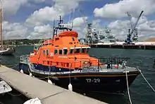• 17-29 Richard Cox Scott – a 17 metres (56 ft) Severn-class AWB entered service at Falmouth on 18 May 2001. This is moored at a pontoon in front of the lifeboat station. It carries a Y-class inflatable boat (number Y193) that can be deployed while at sea.
