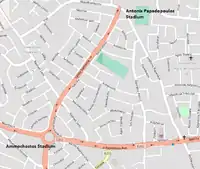 Map of Larnaca which indicates the positions of Nea Salamina's and Anorthosis' stadiums