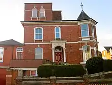 Fambrini appears to benefited from the rapid growth of Lincoln in the latter half of the 19th century. Many houses of the professional classes in the growing suburbs, as well as commercial buildings have artificial stone mouldings, often in the gothic revival style. However, only a few examples of their work can be definitely identified. In 1876 Fambrini had built for himself the large house on the corner of Monks Road (95 Monks Road) and Baggholme Road, and naturally had artificial stone to decorate it. Fambrini called this Florence villa, but after he died in 1890, his house was renamed Villa Firenze.[10] The Companys offices in Canwick Road were designed to exhibit many of the companies products. The eaves cornice have decorative corbels and banding, with above in parapet a projecting panel decorated with pendant flag and wreath. Rainwater heads are in the form of monstrous heads. Side entrance facade has similar elaborate architectural detail. Topped with panel bearing Lincoln City coat of arms surmounted by segmental pediment bearing date 1889. Some red terracotta mouldings are used.