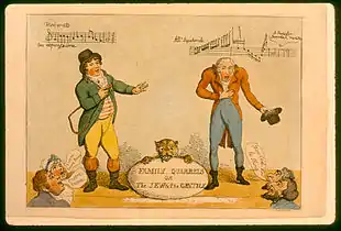 Thomas Rowlandson's cartoon "Family Quarrels" depicting Braham and Incledon does not refer explicitly to the disturbances at Covent Garden, but summarizes the rivalry of these two popular favourites, contrasting Braham's floridity (marked "Allegro squeakando") with Incledon's more stolid approach to singing. In the bottom corners are seen the Jewish fans of the former and the gentile fans of the latter.[13]