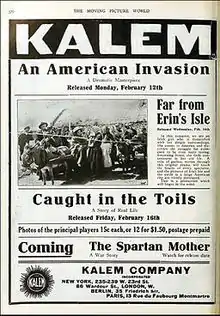 Far from Erin's Isle is a 1912 American silent film directed by Sidney Olcott. It was one of more than a dozen films produced by the Kalem Company filmed in Ireland for American audiences. The film tells the story of a young girl who leaves Ireland for New York, but after losing two jobs and becoming sick, returns home where she is welcomed by her family and her sweetheart.[1]