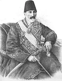 Farhad Mirza (Persian: فرهاد میرزا; 1818 – 1888) was a Qajar prince, administrator, and writer in 19th-century Iran. He was the fifteenth son of the former crown prince Abbas Mirza (died 1833) and younger brother of the third Qajar shah (king) of Iran, Mohammad Shah Qajar (r. 1834–1848).[1]