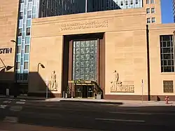 The 1942 Farmers and Mechanics Savings Bank building in downtown Minneapolis, Minnesota, United States is a former bank building that is now the home of a Westin Hotel. The building is an example of the Streamline Moderne phase of the Art Deco movement and is notable for its bold relief sculptures of a farmer and a mechanic framing the main entrance. The sculptures were designed by Warren T. Mosman, who headed the sculpture department at the Minneapolis Institute of Arts.[2] The structure was listed on the National Register of Historic Places in 2006.