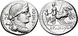 - Lucius Farsuleius Mensor, triumvir monetalis in 75 BC, known from a coin depicting Libertas and a pileus, perhaps alluding to the restoration of the powers of the tribunate that year.[lower-roman 1][1][2][3][4]