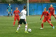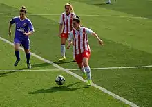 Fatma Kara(white/red) driving the ball for Ataşehir Belediyespor in the 2014–15 season's home match against Kdz. Ereğlispor.