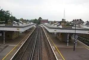 The original 1858 station (built for the East Kent Railway) was rebuilt in 1898 and is an example of London, Chatham & Dover Railway architecture. The buildings are Grade II listed,[1] and have been well maintained by Network Rail in recent years. A brick engine shed (also Grade II listed [2]) has, however, fallen into ruinous condition at the junction to the east of the station, mainly due to its inaccessibility. A further engine shed, formerly on the Faversham Creek spur has now been renovated and converted as offices. Sidings and other small buildings remain, some a legacy from pre-electrification days (1959) when Faversham Shed (73E) was of some importance. The spur line to Faversham Creek has now disappeared and incorporated into a housing development. The track ran along Standard Quay (a building beside the creek). In 1967, the track on Standard Quay was lifted, although a tiny section survives and Iron Wharf still has a few railway goods vans,[3] now used by the boating fraternity. The brick built signal box dated from 1959 when electrification was completed. In 2009 preparatory works were completed before services to London St Pancras via Ebbsfleet International commenced on 13 December 2009. This forms part of the UK's first domestic high speed service (beyond Gravesend) with typical journey times of around 65 minutes. The Chatham Main Line was re-signalled east of Faversham during 2011, and the Faversham signal box was decommissioned in late December (still remaining in situ in August 2014). Signalling responsibilities were transferred to the power box at Gillingham.
