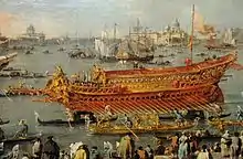 Finally, the Venetian Bucentaure was well known from the 1500s onwards, thanks to the circulation of the printed version of Jacopo de' Barbari's Vue de Venise, and any large boat at the time took on the qualifier; Maurice Scève thus spoke of the king's vessels in one of his texts: "were the aforementioned vessels, first and foremost a Bucentaur from one of the biggest boats on the whole river".[37]