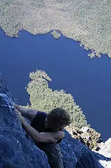 With an elevation of 1,224 metres (4,016 ft) above sea level the last stretch of the route up is extremely steep and exposed, involving rock climbing moves 600 metres (2,000 ft) above Lake Geeves.[3] Its reputation is such that Sir Edmund Hillary declared it "Australia's only real mountain".[4]