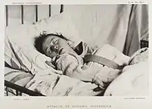Jean-Martin Charcot argued that hysteria derived from a neurological disorder and showed that it was more common in men than women.[4] Charcot's theories of hysteria being a physical condition of the mind and not of the body led to a more scientific and analytical approach to hysteria in the 19th century. He dispelled the beliefs that hysteria had anything to do with the supernatural and attempted to define it medically.[15] Charcot's use of photography,[16] and the resulting concretization of women's expressions of health and distress, continued to influence women's experiences of seeking healthcare.[17] Though older ideas persisted during this era, over time female hysteria began to be thought of less as a physical ailment and more of a psychological one.[18]