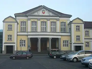 The Festhalle was completed in 1913 to plans by the municipal architect Eugen Frielingsdorf. The industrialist Josef Kaiser, who had the headquarters of his locally founded company Kaiser's Kaffeegeschäft in Viersen, initiated the construction of the building by donating 130.000 Marks (ℳ) on the occasion of his appointment to royal Kommerzienrat (Councillor of Commerce). Up until 1925 the building was used as projected, as a multipurpose hall, that is as a ballroom and for gymnastics as well as for cultural events. But the gymnastics use was soon dropped. During World War II the festival hall, unlike many other venues in Germany, was luckily only slightly damaged and could soon be used again. It has been renovated and redesigned several times, including in 1939–40 for propaganda purposes of the NSDAP.[1] In 1997, thanks to the efforts of the Festhallen-Förderverein (Friends of the Festival Hall) it was provided with, among other things, new seats and state-of-the-art stagecraft.