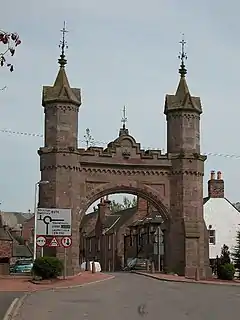 A memorial archway erected in 1864 commemorates the 1861 visit by Queen Victoria and Prince Albert, while staying at Balmoral. Leaves from the journal of our life in the highlands describes aspects of their visit. Queen Victoria writes "At a quarter-past seven o'clock we reached the small quiet town, or rather village, of Fettercairn, for it was very small-not a creature stirring, and we got out at the quiet little inn, "Ramsay Arms" quite unobserved". "Louis and General Grey had rooms in an hotel, called "The Temperance Hotel" opposite". "The evening being bright and moonlight and very still, we all went, and walked through the whole village, where not a creature moved:- through the principal little square, in the middle of which was a sort of pillar or Town Cross on steps, and Louis read, by the light of the moon, a proclamation for collections of charities which was stuck on it". "Suddenly we heard a drum and fifes!". "As we walked slowly back, we heard the noise from time to time- and when we reached the inn door, we stopped and saw six men march up with fifes and a drum (not a creature taking any notice of them), go down the street and back again". "Albert asked the little maid, and the answer was, "It's just a band" and that it walked about in this way twice a week. How odd! It went on playing some time after we got home".