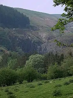 The River Twymyn flows from the 40-metre-high (130 ft) Ffrwd Fawr Waterfall at the head of the Pennant Valley at Dylife Gorge near Dylife.