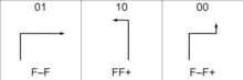 • From the Fibonacci word, one can define the «dense Fibonacci word», on an alphabet of 3 letters: 102210221102110211022102211021102110221022102211021... (sequence A143667 in the OEIS). The usage, on this word, of a more simple drawing rule, defines an infinite set of variants of the curve, among which: