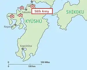 The Japanese 56th Army was formed on April 21, 1945, under the Japanese 16th Area Army as part of the last desperate defense effort by the Empire of Japan to deter possible landings of Allied forces in northern Kyūshū during Operation Downfall. The Japanese 56th Army was based in Iizuka city, Fukuoka Prefecture. It consisted mostly of poorly trained reservists, conscripted students and Volunteer Fighting Corps home guard militia. It was demobilized at the surrender of Japan on August 15, 1945, without having seen combat.