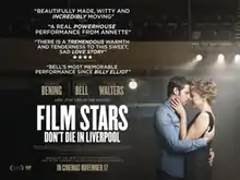 Film Stars Don't Die in Liverpool is a 2017 biographical romantic drama film directed by Paul McGuigan and starring Annette Bening and Jamie Bell, with a cast that includes Vanessa Redgrave and Julie Walters. It is based on the memoir of the same name by Peter Turner, which tells of his relationship with Academy Award-winning American actress Gloria Grahame in 1970s Liverpool and, some years later, her death from stomach cancer.