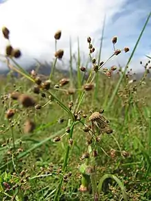 The annual grass-like or herb sedge typically grows to a height of 0.05 to 0.7 metres (0.16 to 2.30 ft) and has a tufted habit. In Australia, it blooms between February and August and produces green-brown flowers.[2] It has slender culms slender with a length of 40 to 60 cm (16 to 24 in) that are four or five-angled and quite flattened. The leaves are up to a length of 40 cm (16 in) and are 1.5 to 2.5 mm (0.059 to 0.098 in) wide with stiff and threadlike basal leaves that are about half the length of the culm. The inflorescence has a diffuse compound umbel with a length of 6 to 10 cm (2.4 to 3.9 in) with spherical to ovate shaped reddish-brown spikelets with a length of 2.5 to 4 mm (0.098 to 0.157 in) and a width of 1.5 to 2 mm (0.059 to 0.079 in) that are round or acute toward the apex. It has ovate 1 mm (0.039 in) long spirally arranged glumes and yellow anthers.[1]