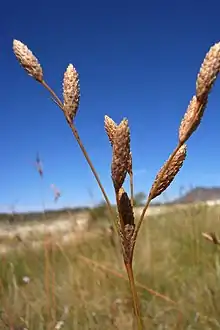 Fimbristylis thermalis grows in alkaline mud and sand, especially around hot springs and mineral-rich seeps. This is a thick-stemmed sedge which grows singly or in clumps and reaches maximum heights over a meter. It has a long rhizome system. It has short, flat, spiral-arranged leaves. At the top of the stem is an inflorescence of ovate, pointed spikelets, each on a long peduncle. The spikelet has many hairy bracts. The fruit is a shiny brown achene one to two millimeters long.[4][5]