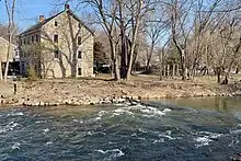 The area was first built up as a permanent settlement due to the construction of Chelsea Forge, built in 1751,[16] a charcoal-iron forge on the Musconetcong.[17] The forge helped to provide the Continental Army with weapons to defend Valley Forge. The Shank Brothers ran a ferry across the Delaware River from the point where the Musconetcong empties into it prior to 1800.[18] The Fein gristmill burned and was later rebuilt as the Riegel Paper Corporation's paper mill[19] and became the Taylor Stiles and Company knife factory.