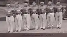 Finnish gymnastics team at the 1937 Workers' Olympiad in Antwep, Belgium.