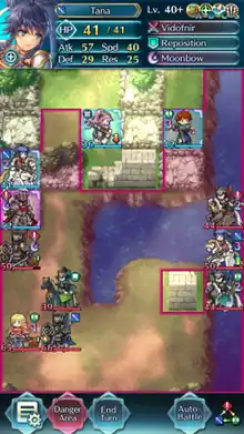 Fire Emblem Heroes is a tactical role-playing game. Players control a team of up to four characters ("Heroes") against enemy teams of varying sizes on an 8x6 grid map. Different characters have different movement restrictions; for example, armored units have a shorter range than cavalry units, but cavalry units cannot enter forest tiles. Flying units can enter most tiles, even ones impassable to all other units such as water or mountains. The game strictly alternates between a player phase and an enemy phase every turn. During the player's phase, Heroes can attack enemy characters when in range; if both the attacker and defender have the same range, the defender will counterattack if still alive. Heroes deal either physical or magical damage types; they also have a "color" that informs a rock paper scissors-esque system that makes it so some units have advantageous match-ups over other units. After moving and optionally attacking with all their heroes, the enemy phase occurs where the game's AI does the same for the opposing team of characters. The player, in general, seeks to lure enemy units into disadvantageous match-ups by careful character positioning on the map.[1] Unlike other Fire Emblem titles, there is no element of randomness or chance in battles; an engagement between two characters is perfectly deterministic, as is the enemy AI, so a given strategy will either win or lose consistently. Fire Emblem Heroes has a set of "story" missions divided by chapters for the player to complete, rotating challenge missions, a training tower for increasing character's strength in random battles, fights against other players' teams (albeit controlled by the game's AI) in the "Arena" and in "Aether Raids", special challenges involving "Brigades" where teams with eight or more characters are controlled on a larger map than usual, and a variety of other content to complete.