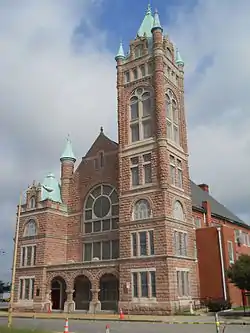 First Baptist Church is a historic African-American Baptist church located in Norfolk, Virginia. It was designed by architect R. H. Hunt and dedicated in 1906. It is a Romanesque Revival-style church with a richly ornamented facade of rough-faced, pink granite ashlar and limestone trim. It features a tall, eight-level corner tower with a multiplicity of window types and a shorter flanking tower at the opposite corner.[3] Construction began in 1904.[4]