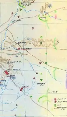 On 28 February, Chetwode's Desert Column occupied Khan Yunis unopposed and the headquarters of the Column was established at Sheikh Zowaiid, while Eastern Force headquarters remained at El Arish.[6] The ancient town of Khan Yunis on the main road to Gaza was said to be the birthplace of Delilah. With bazaars, narrow streets and a castle, it was one of several villages in this fertile area of southern Palestine, 6 miles (9.7 km) north of Rafa and the Egyptian–Ottoman frontier. Here was found the largest and deepest well in the area, and after engineers had installed a pumping machine, it gave an unlimited supply of water for both men and horses. The village quickly became an important forward site for supply depots and bivouacs.[8][25] Around Khan Yunis gardens, orange orchards, fig plantations and grazing were carried on by the local population, while in the Rafa and Sheikh Zowaiid areas barley and wheat were grown.[8][9][10]