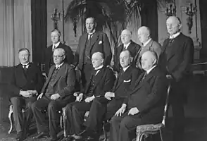 Well into the heart of the German middle class, it was thought that coalition governments were too weak to deal with the country's problems, or at least that the second Müller cabinet had shown this to be the case. Hindenburg appointed Brüning as chancellor "with the note that his cabinet was to be put together without regard to coalition ties".[1] Brüning nevertheless took over Muller's second cabinet with only three changes. Hindenburg himself had insisted on the appointment of two of the new members: Martin Schiele of the German National People's Party (DNVP) for Agriculture and Gottfried Treviranus of the Conservative People's Party (KVP) for the Occupied Territories. The resulting cabinet was made up of members of seven parties – 4 Centre Party, 2 German Democratic Party (DDP), 2 German People's Party (DVP) 1 Reich Party of the German Middle Class (WP), 1 Bavarian People's Party (BVP), 1 DNVP and 2 KVP – plus one independent.[2]